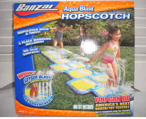 WITH THIS STAY COOL SPLASH MAT, ITS NEVER TOO HOT FOR HOP SCOTCH. THAT'S BECAUSE EACH TIME LITTLE JUMPERS LAND ON A BOX, THEY'RE REWARDED WITH A REFRESHING SPRAY OF WATER!