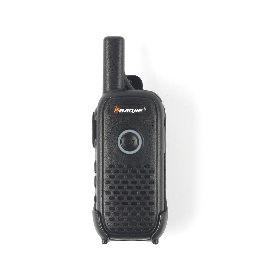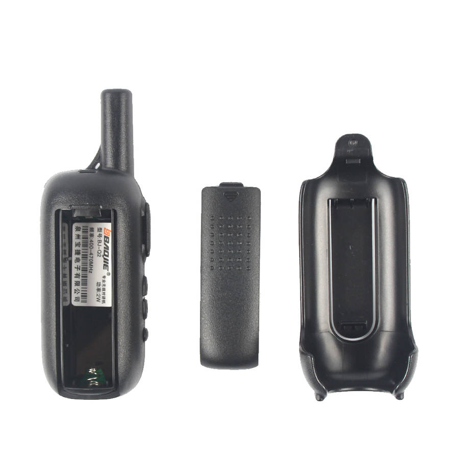 Specifications: Frequency: 400-470MHz Channel capacity:16 Voltage:3.7 V DC ±20% Working mode:Same frequency simplex or different frequencysimplex Antenna:Built-in antenna Frequency stability:±2.5ppm Temperature:20 ~ 60a Dimension:136mm X 59mm X 21mmdoesnat include belt clip Weight:93gdoesnat include belt clip Transmitter RF output power:2W/0.5W Modulation mode:F3E Maximum frequency deviation:a5KHz Adjacent channel power:60dB SNR ratio:-40dB Stray power:a7.5uW TX current:1.0A Receiver RX sensitivit:0.25V 12dB SINAD Adjacent channel selectivity:60dBW/N Inter-modulation:60dB Audio distortion:a5 Audio output power:a1W8 68 RX current:a300mA Standby current:a20mA Package Included: 1 x Baojie BJ-Q2 Mini Walkie 1 x Battery 1 xCable