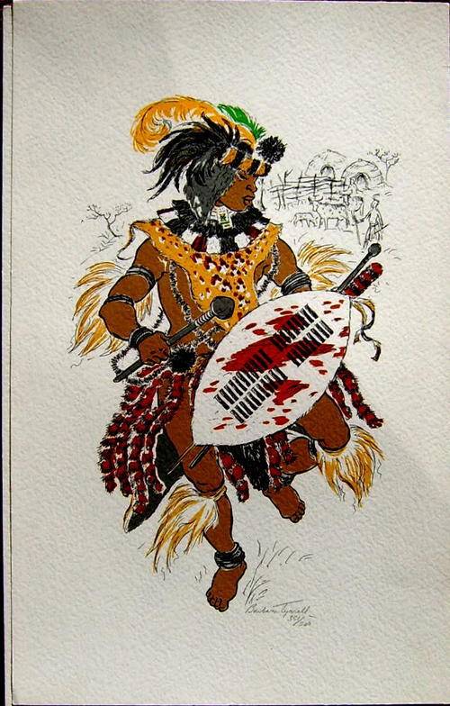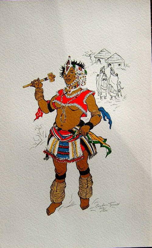 Barbara Tyrrell is an internationally recognized artist known for her detailed costume studies of the traditional dress of the tribal peoples of southern Africa.The artist was born on March 15th 1912 in KZN and died at Fishhoek in the Cape at the age of 103, on September 23rd, 2015. Her paintings in water colour, gouache and oils constitute one of the most important historical records of a world that was vanishing even as she worked. She always drew from life, which gave her work an integrity not found in the work of artists using secondary sources, such as photographs, as reference. Her father, who died while she was a small child, had occupied the post of assistant magistrate and later interpreter in the Department of Native Affairs in Zululand. Her grandfather was Frederick Fynney, interpreter and companion to the Zulu King Cetshwayo (1826 – 1884).
