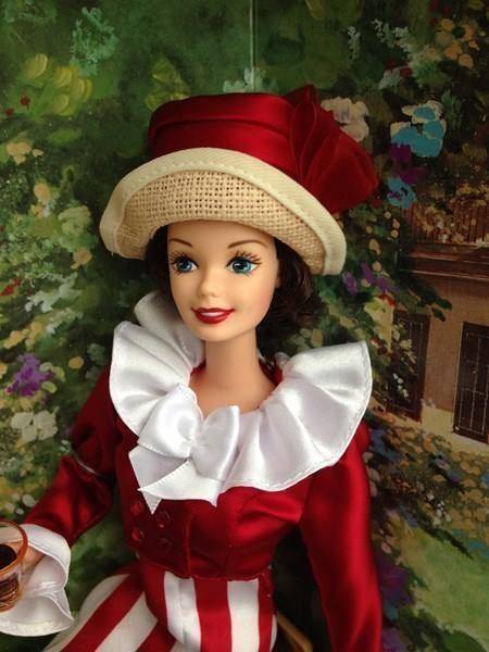 The second doll in a series, After the Walk Barbie doll is dressed fashionably in an exquisite ensemble inspired by the advertising for COCA-COLA. Relaxing after a walk on a hot summer's day in 1916, Barbie looks cool and refreshed in a perky COKE red and white dress and jacket. She holds a specially made replica of an authentic flare glass, as if, like in the ad, she's about to sip the Real Thing. Through her we see not only how we looked in the very latest fashions of the time, but also glimpse at America's past. The beautiful ads from COCA-COLA, illustrated in glorious color and detail
