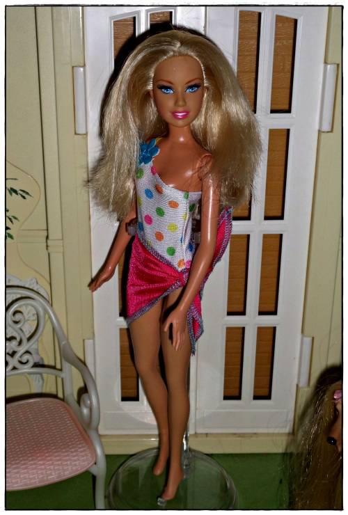 This is a beautiful, previously-loved Barbie doll made by Mattel. She has silky soft blonde hair, blue eyes and pink lips. She is wearing a 2-piece Barbie-sized swimming outfit, but unfortunately no shoes. She has a bellybutton bodyshape with ballerina arms and bendable legs. Please note that there are very minor marks to her hands - see pictures please. Contact me with any questions you might have regarding this doll!