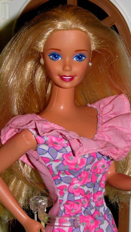 genuine Barbie dress, unfortunately missing her shoes.Beautiful face with blue eyes, soft pink
