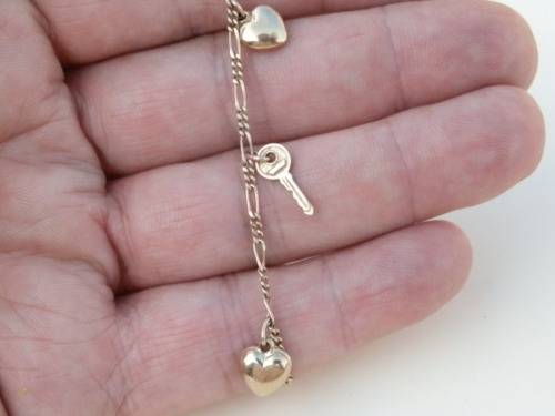 Gorgeous 9 ct yellow gold charm bracelet, marked 375 and in good condition. The length is 19 cm, the length of the charms, loops included: heart charms is 8 mm each, the key charms 15 mm each and the total weight is 3.7 g. Stunning!!