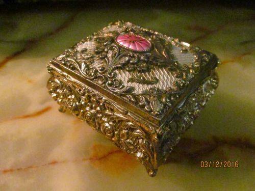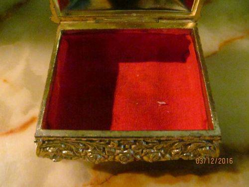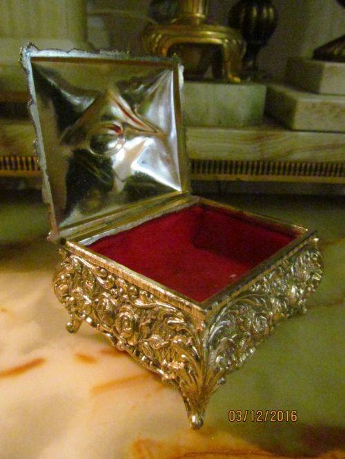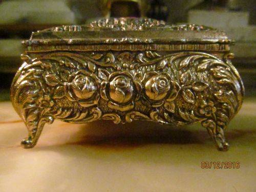 The item is crafted in Cast metal with a Gold Tone and is very lavishly decorated throughout in Ornate Roses, Floral and Leaf Pattern. There are Four rests/feet upon which this BEAUTIFUL item stands and the Lid is Hinged. In the center of the Lid is an oval shaped Faux Jewel. The interior of the Trinket Box is Luxuriously lined with Red Velvet material and is very soft