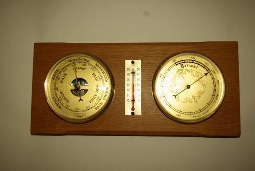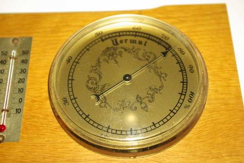 Barostar - barometer, hygrometer, thermometer mounted on oak. Dimensions = 285 x 35 x 130 mm. SAPO postage will be R38 or Postnet R99, counter to counter. I do not know how accurate the instruments are. They do move around and reflect an increase in humidity and temperature. There are some light scratch marks on the rear near the wall mounting hole.
