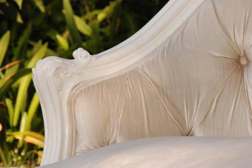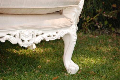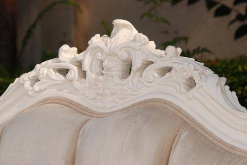 An ornately hand carved, solid cherry wood sofa in the Rococo manner defining classic Louis XIV styling. Know as the Canapé à Confidents (Confidants couch), this Louis XIV style sofa boasts a high gloss white finish with ornate pearl white velvet upholstery.