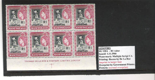 SG 120A: Unmounted mint R1 value of Basutoland stamps overprinted Lesotho and issued 1 November 1966. On offer is an imprint block of 8 with the imprint in large font with watermatk Multiple Script CA. Please contact me if any further information is required. You will receive the item shown in the image below.