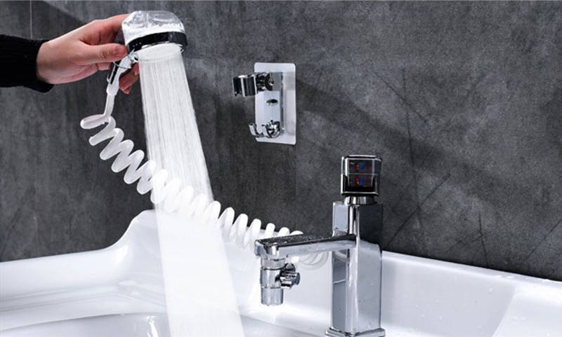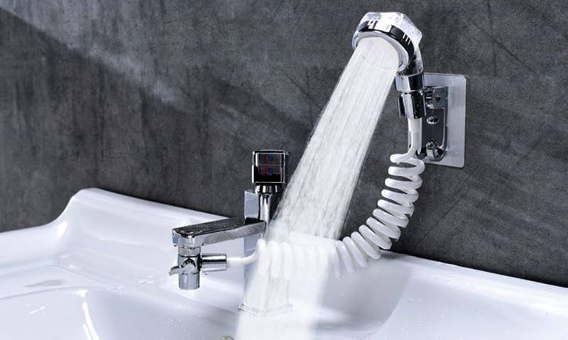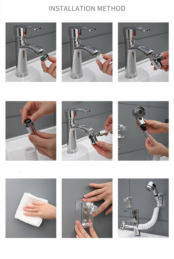Install Methods: 1. Remove the original faucet spout. 2. Install the appropriate conversion thread. 3. Then install the diverter valve on the conversion thread. 4. Open the caps on both ends of the telescopic tube in turn, taking care not to lose the gasket. 5. Install one end of the telescopic tube directly on the diverter valve. 6. Then install the other end of the telescopic tube directly on the shower. 7. Then wipe the installed wall with a dry towel. 8. Install the punch-free bracket in a suitable position. 9. Finally, install the shower.