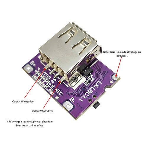 - This module is equipped with lithium battery charging and discharging protection. If the battery is equipped with protection, please remove it. The battery capacity should be large enough to output 3.1A current.