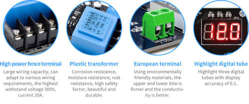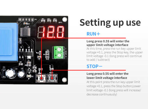 Set Starting Voltage: In normal display voltage state,press the button will display start charging voltage;long press for the digital tube will flash;you can start or stop button to set starting up charge voltage value