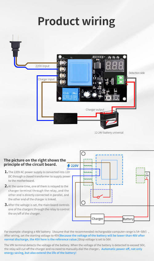 Set Starting Voltage: In normal display voltage state,press the button will display start charging voltage;long press for the digital tube will flash;you can start or stop button to set starting up charge voltage value