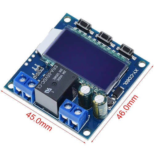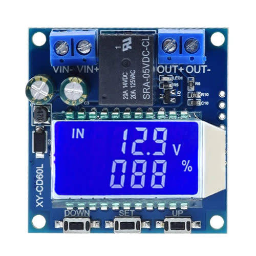 By setting the upper limit voltage UP and the lower limit voltage dn; when the battery voltage is greater than or equal to the upper limit voltage UP, the relay turns on and starts discharging; when the battery voltage is less than or equal to the lower limit voltage dn, the relay turns off and completes an automatic discharging function; when the relay turns on, the OUT flickers, indicating that it is discharging.
