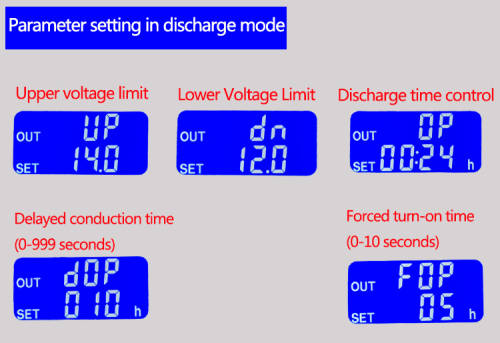 By setting the upper limit voltage UP and the lower limit voltage dn; when the battery voltage is greater than or equal to the upper limit voltage UP, the relay turns on and starts discharging; when the battery voltage is less than or equal to the lower limit voltage dn, the relay turns off and completes an automatic discharging function; when the relay turns on, the OUT flickers, indicating that it is discharging.