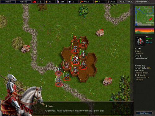 The Battle for Wesnoth is a turn-based wargame played on a hex map. The strategy of battle involves fighting on favorable terrain, at a favorable time of day, and with enemies weak against the player's units. Other concerns are capturing villages that produce gold for unit recruitment, and positioning units to restrict enemy movement. Games of Wesnoth come both in the form of single-player campaigns and multiplayer matches.
