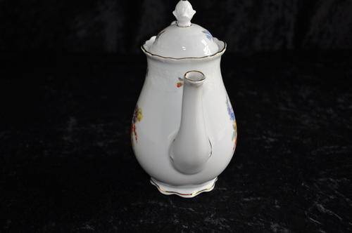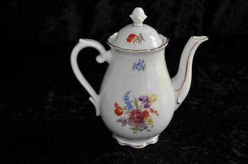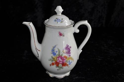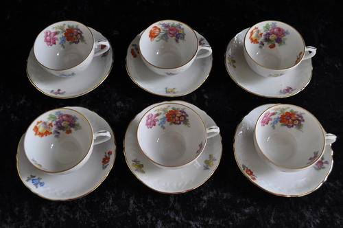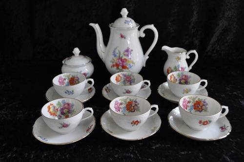Measurements: Saucers 10,5cm in diam. Cups 4,5cm in height, 7cm in diam excl handle. Milk 8cm in height, 9cm spout to handle. Sugar 8cm in diam. 8,5cm in height. Coffee pot spout to handle 16,5cm base to lid 17cm.