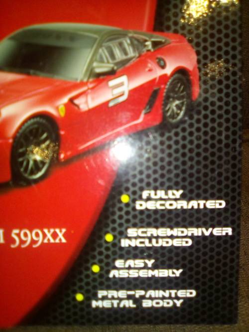 Ferrari , Race and play , Assembly Kit . Build your own 599XX . Die-cast metal body 1:43 . Fully decorated , screwdriver included , easy assembly , pre painted metal body . 24 pieces . No glue or paint needed . Never opened .