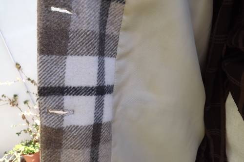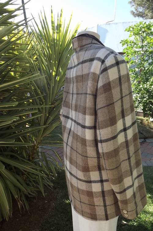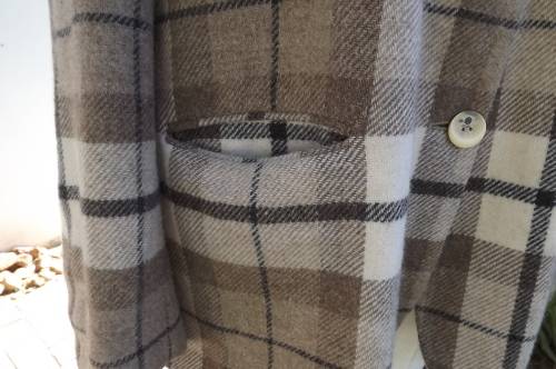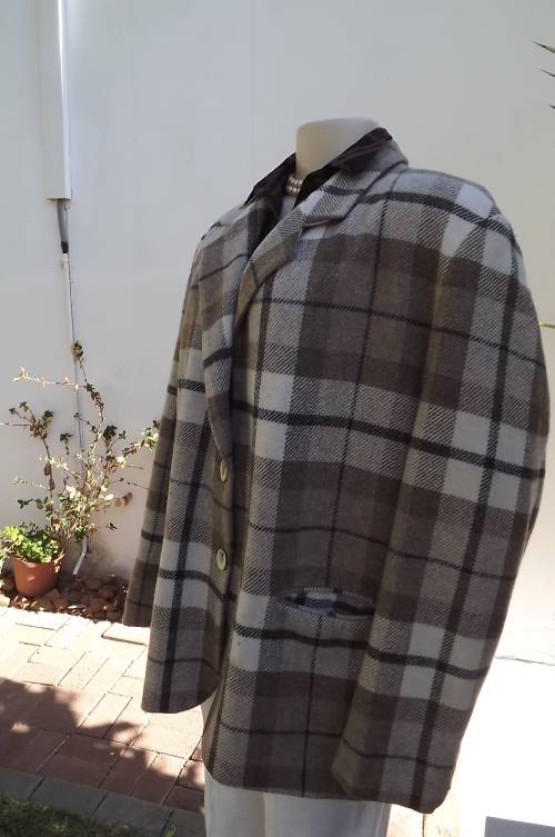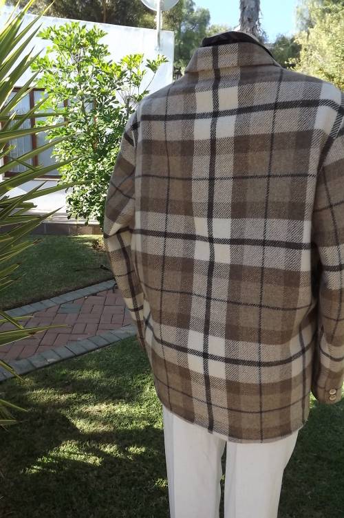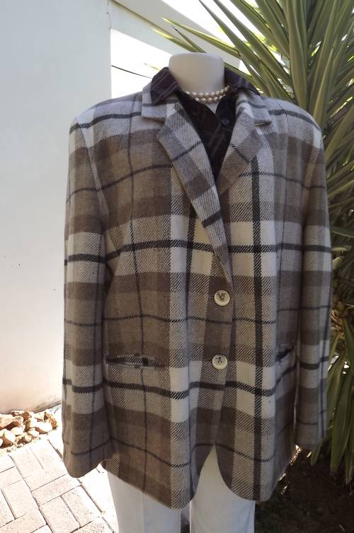 Be stylish and warm this winter in this woolen lined jacket.Size 44/20.Light brown,beige and dark brown check pattern. 2 pockets on front.In blazer style with 2 buttons on front.As new
