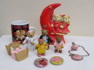 GREAT LOT FOR THE BEAR LOVER - A VASE , A MINIATURE I LOVE YOU MUG , TWO BADGES , A NECKLACE , A FASHION RING AND SOME 1990S BEAR COLLECTABLE TOYS . RANGING FROM 4 CM TO AROUND 12 CM HIGH . ALL UNDAMAGED PIECES .