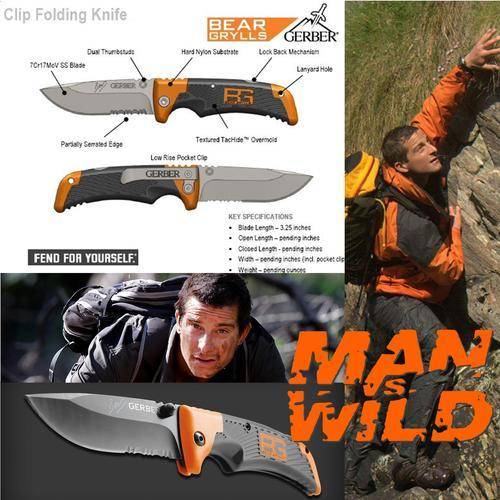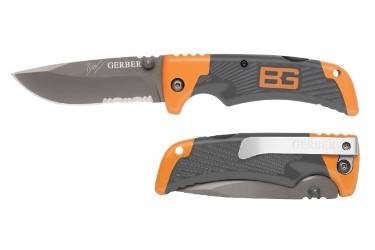 Thin and Lightweight Folding Knife; Clip for convenient pocket carry; Dual-Sided Thumb Stud – For easy single-hand opening; ½ Serrated High Carbon Stainless Steel Drop Point Blade – ideal for edge retention and cutting rope; Ergonomic Textured Rubber Grip – Maximizes comfort and reduces slippage Lock Back - Locks blade securely in place and maximizes safety during closing; Priorities of Survival – Pocket guide contains Bear's survival essentials.