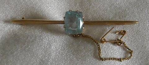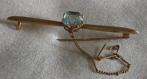 BEAUTIFUL 15ct GOLD BAR BROOCH WITH EMERALD CUT AQUAMARINE