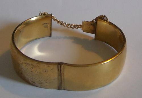This is a lovely 9ct gold metal core bangle with press open clasp and safety chain. Weighs 40.2grams metal core included. Stamped inside bangle "1/5th 9ct Metal Core". Ladies name of "Muriel" engraved on front amongst foilage pattern. Back of bangle has no pattern. Not the original safely chain it has been replaced with a plated chain. Comes in the original bangle box . Measures 2cm in height, and has circumference of 21cm. A lovely bangle which is more than 30 years old. Postage R25