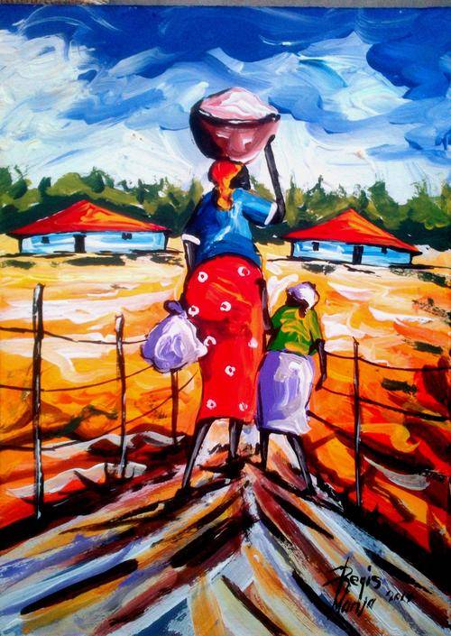Beautiful acrylic painting by artist Regis Manja titled- Doing the washing