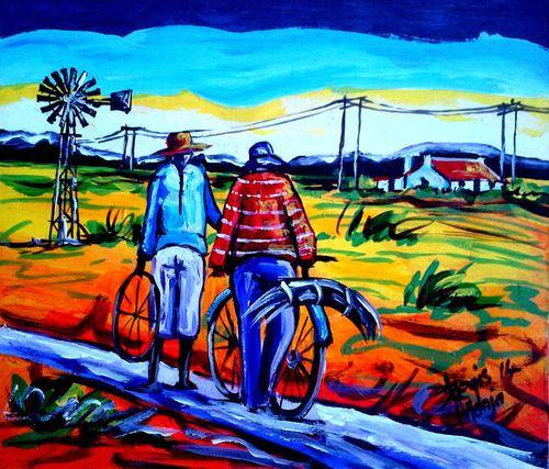 Regis Manja was born 1977 in Zimbabwe and has had a love for art since childhood. Regis is self taught and his talent is a raw natural talent. He takes inspiration from daily life capturing it in beautiful and vibrant colours. Regis travels from town to town making a living from his art