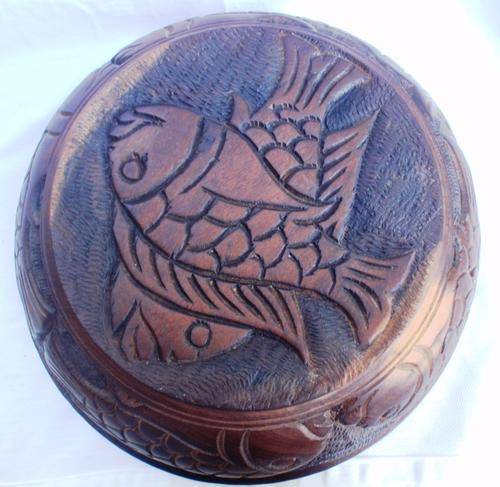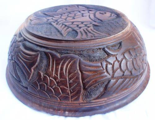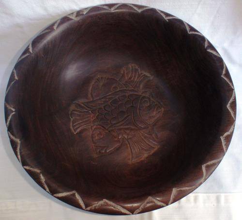LARGE - STUNNING WOODEN HAND CARVED WITH FISH DESIGN BOWL - BEAUTIFUL WOOD. SIZE: DIAMETRE AT TOP 32CM X HEIGHT 10CM.