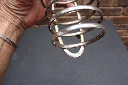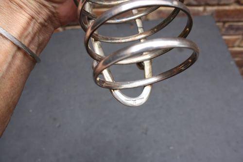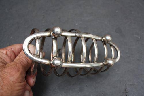 PLEASE CHECK THE INTERNET REGARDING THE WELLNER SILVER.TOAST RACK : HAS A DIAM. OF OF APPR.67 MM AT THE END AND A DIAM. OF APPR.82 MM AT THE CENTRE.IT'S APPR.130 MM LONG.BOTTOM PART 165 MM LONG AND APPR. 53 MM WIDE AT THE CENTRE.FEET APPR. 12 MM IN DIAM.MARKING:WELLNER & SOEHNE.UNDERNEATH IS A 10 IN A CIRCLE.WEIGHT: APPR.323 GRAMS