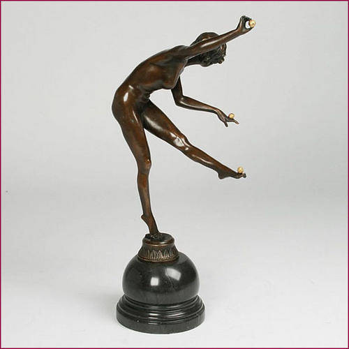 A superb, delicate Art Decó marble and bronze figure of a naked juggler playing marbles while balanced on her tiptoes. Rose on black marble base.Signed by CL.J.R.Colinet.