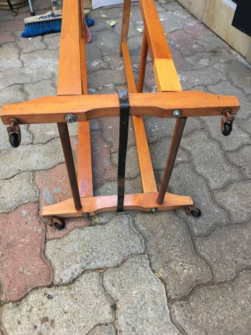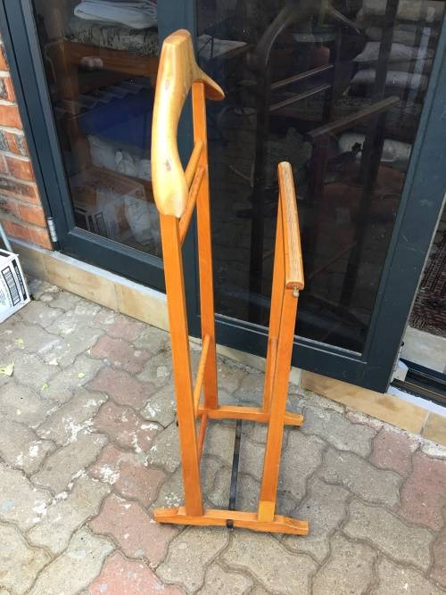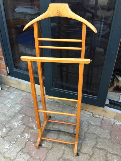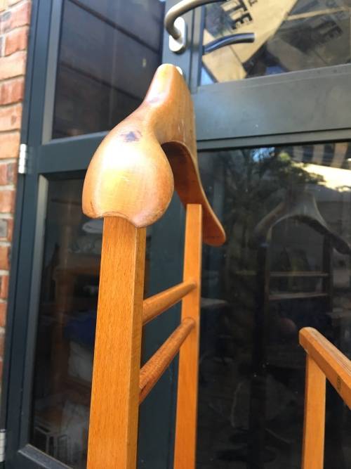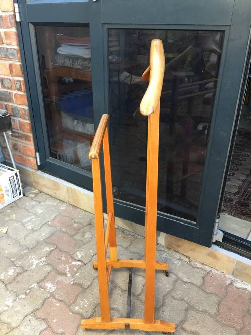 A STUNNING PRACTICAL BEECHWOOD DUMB VALET ON CASTORS WITH BRASS PINS FOR HANGING UP SOCKS AND SHOE RAIL AT THE BOTTOM TO KEEP YOUR SHOES OF THE FLOOR