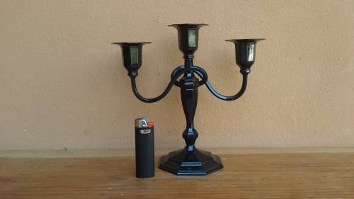 Beautiful black, metal candle stick. Sprayed black, sturdy and in a lovely condition. Perfect to use any where, any time. Also makes a beautiful center of a table display.
