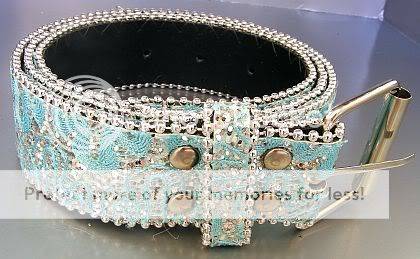BEAUTIFUL BLUE LACE AND GLITTER BELT EDGED WITH SILVER BEADS