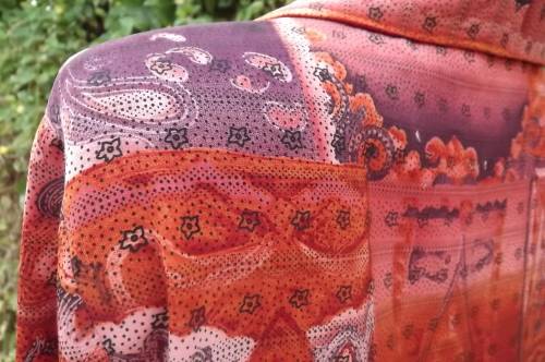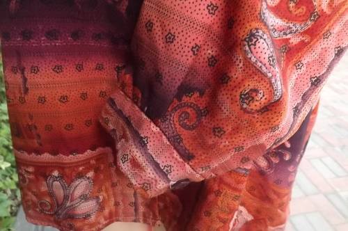 Beautiful bohemian print long sleeve blouse size 42/18 by ROSELLA.Dark mulberry and brick colours in firm wash + wear polyester.Button down with shirt collar.As new