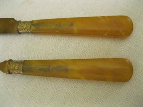 You are bidding on a beautiful fruit Set 6 plate setting with gold mother of pearl style handles and gold plated knives and forks boxed in the original box.