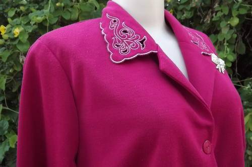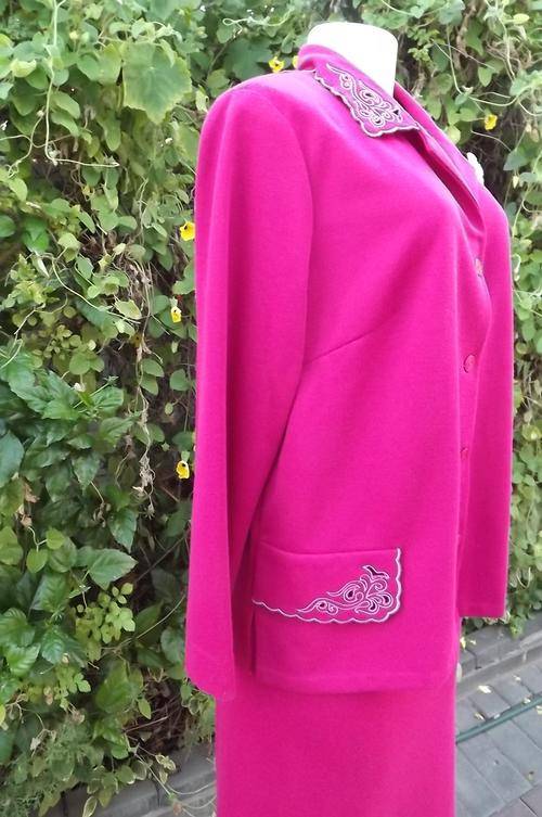 Beautiful cerise pink 2piece Ruca skirt and jacket outfit.Size 40/16 by Wolpe Fashion Holdings.Polyester / Wool blend.Cut-out embroidered collar and dummy pockets on button down jacket.Straight skirt with elasticated middle.Very good condition