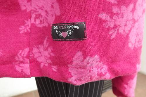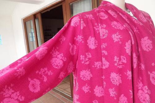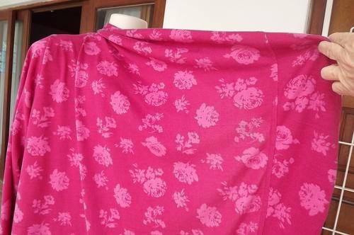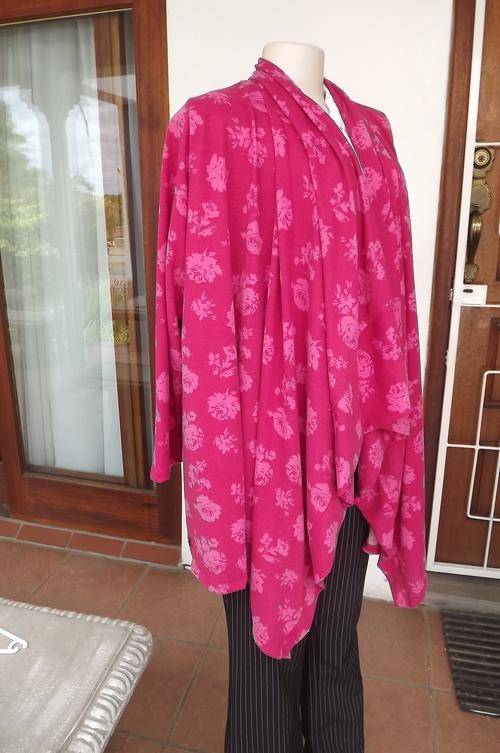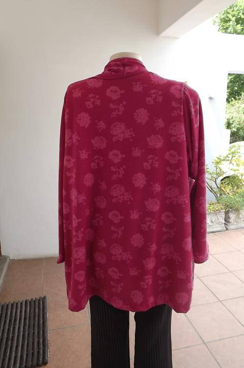 Beautiful cerise pink loose top in a knitted stretch polyester.Size 46/22.With lighter pink rose pattern.Wide loose collar and fronts in waterfall style.As new