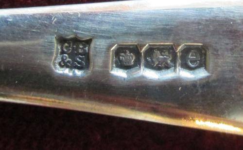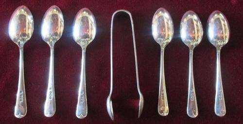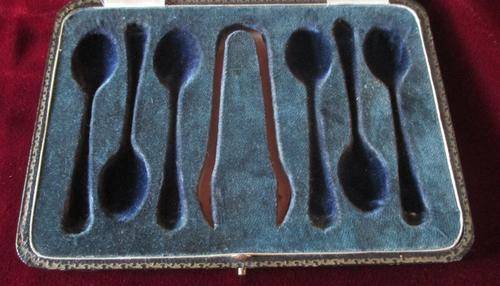 Beautiful silver spoons and ice tong set by Charles Boyton and son.in a leather case. Consisting of tea 6 spoons and 1 sugar tongs. See condition of case. Shipping R50.00