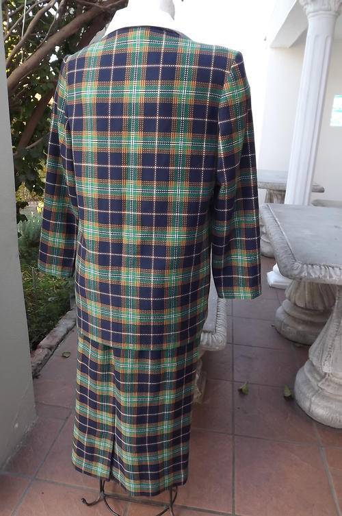 Vintage Checkered Suit from Woolworths in size 10/34 - Polyester/Viscose - Skirt has elastic at middle - to fit 91cm hip - Jacket has navy inlay with buttons - suit in excellent condition