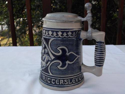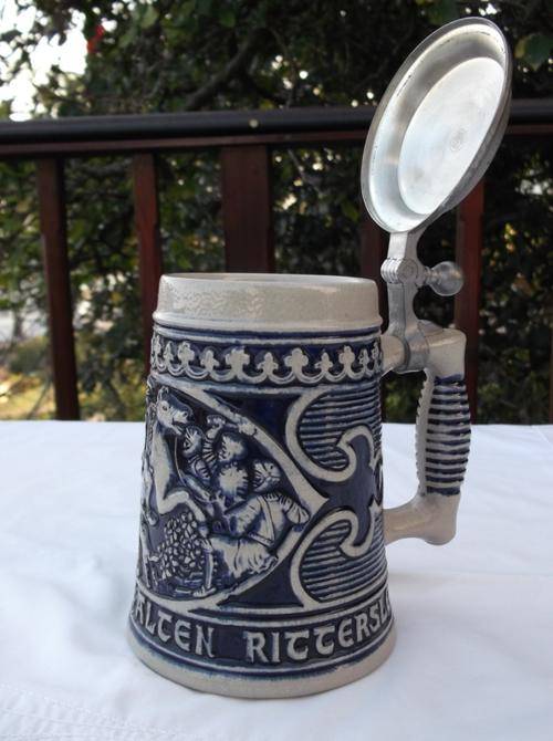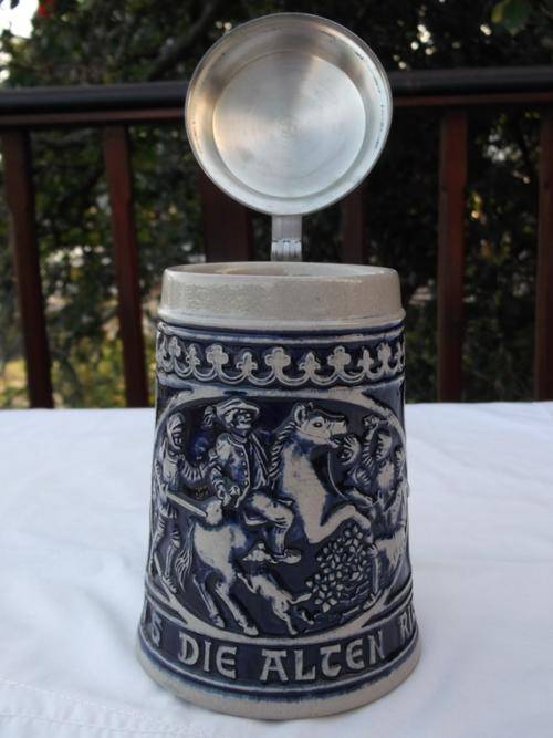 The picture is of a group of armed soldiers, one of whom is in the process of being knighted, and the motto "Ja, so warns die alten rittersleut" which loosely translates to "So the old knights warned us", Referring to an old German drinking song. We think that the cobalt blue is simply stunning - also note the markings in the lid for authenticity. Please note that the pictures form part of the description and we urge you to check them out...