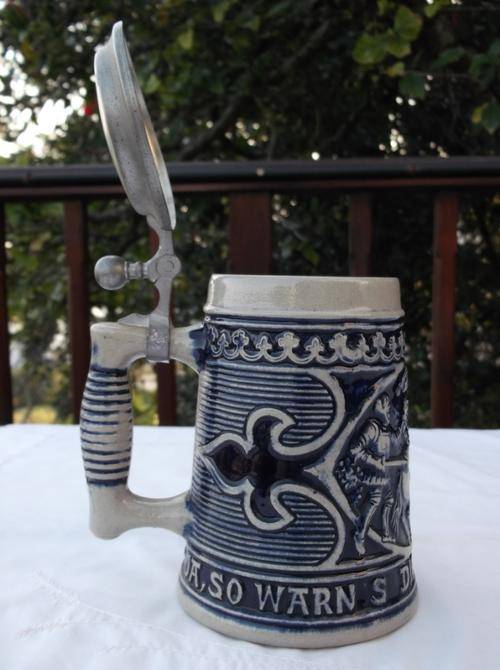 We have a highly collectible Vintage German Gerz lidded beer stein on auction. There are no chips or cracks that we can discern. The item stands just over 15cm high, and is about 8cm wide at the rim.