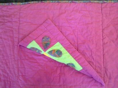 The reverse side is a plain pink with a little hidden quilted pocket.