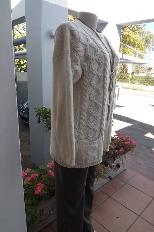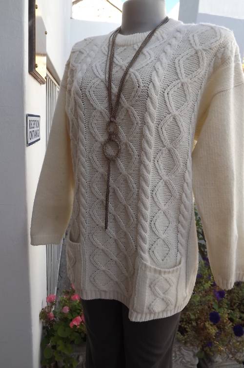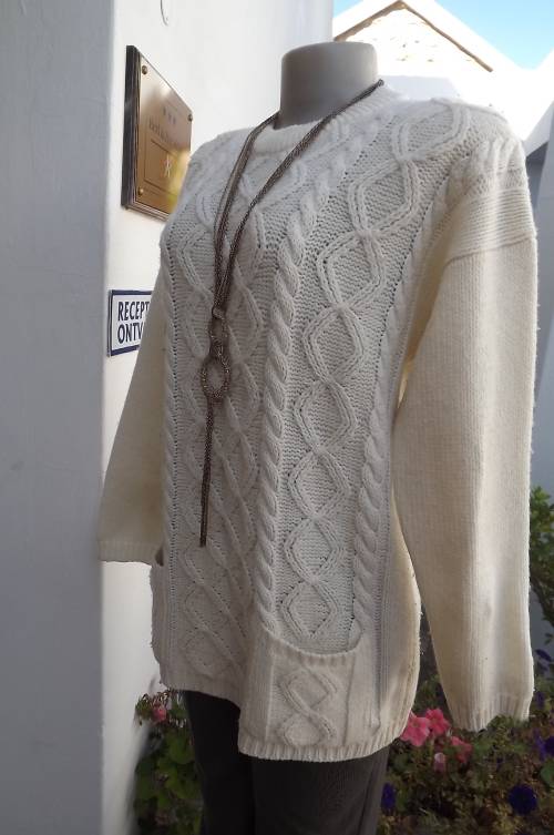 Beautiful cream double knit jersy with crew neck by 2 Club.Size 42/18.front knitted in cable and aran stitch.two seam pockets on front.In very good condition.
