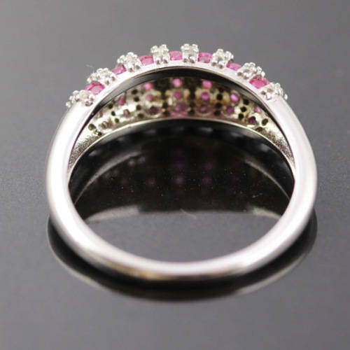 This eye-catching piece presents a lively combination of colours. This beautifully designed ring features raspberry-hued ruby gemstones claw set in sterling silver. The seven curved rows of rubies run in parallel and are separated by eight slightly raised rows of natural white topaz, claw set in parallel lines to mirror the curve and design of the rubies as they march in parallels down the ring head. The rubies are real gemstones that have been heat treated. The ring head is softly domed, measuring 8mm long x 16 mm across the finger. The ring weighs 2,96 grams and bears the 925 hallmark indicating sterling silver. Very classy. Very elegant.