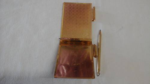 BEAUTIFUL ELEGANT Vintage BRASSLIKE NOTE BOOK AND PEN HOLDER. LOVELY LITTLE COLLECTIBLE.
