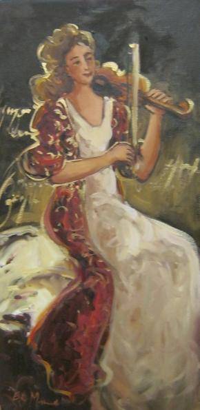 An original oil painting, 60x30cm oil on stretched canvas by Este Mostert - unframed. Este is a painter of what may best be termed romantic dream worlds; often landscapes peopled with esoteric figures, all of them the result of an image bank of pictures she has created and stored over the years, She has the ability of many talented artists of conjuring up these images, complete with finite detail, and then conveying them onto canvas. It’s a sort of visual transfer of mental snapshots, some of them stemming back to her childhood.