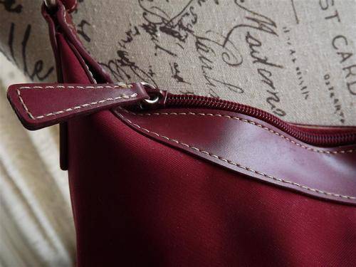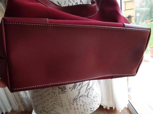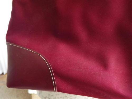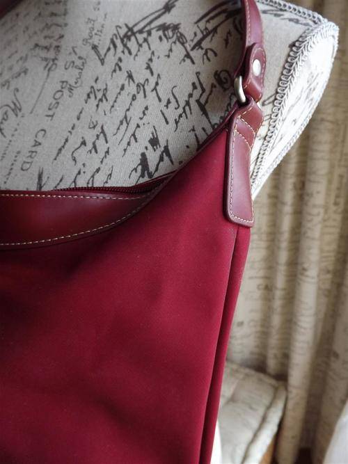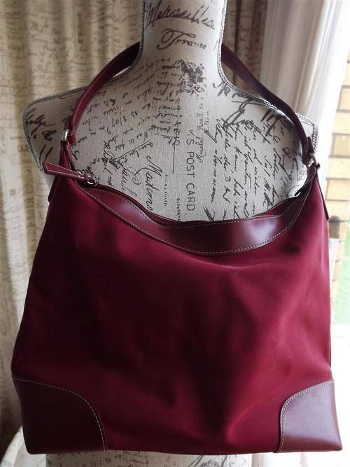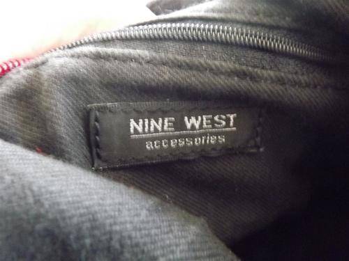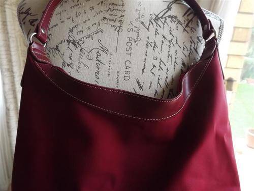 On offer a second hand very good condition Genuine Nine West Burgundy/Maroon Red Sateen fabric and leatherette trim ladies hobo design bag, with single handle strap. Bought in New York City. It has a zip opening with an inner pocket. A very stylish bag by Nine West.