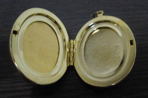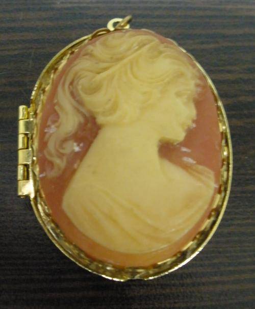 Beautiful gold tone locket pendant with a resin cameo lady portrait in center