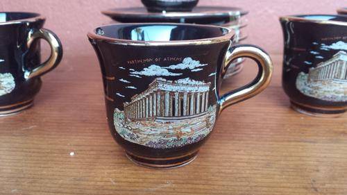 Beautiful Greek Turkish coffee set. Still in its box and never been used, so it is in a perfect, absolutely stunning condition. Six little cups and saucers all rimmed in 24 carat gold. Awesome to display on one of those stands.