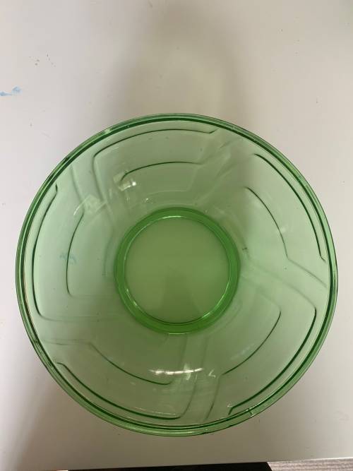 Very pretty and large green art deco glass bowl at a steal. This is a very pretty bowl and in a very pretty shade of green (not your ordinary green glass). The line detail gives it a distinctly art deco vibe and it is in perfect condition.